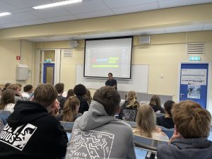 Het was een boeiende gastles van een bevlogen schrijver die vertelde dat hij niet alleen op zijn zolderkamer boeken schrijft, maar ook bij jongeren politiek bewustzijn probeert te creëren door het produceren van podcasts en documentaires over maatschappelijke thema’s. Hij toonde daarbij fragmenten uit een documentaire in wording, die met behulp van kunstmatige intelligentie wordt gemaakt. In deze fragmenten is de kenmerkende toon van Johan Fretz duidelijk hoorbaar.